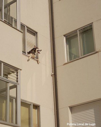 Un aviso ciudadano a la Sala del 092 propició la actuación urgente de la Policía Local de Lugo y del Servicio de Bomberos para salvar a un animal de una inminente caída al vacío desde un piso en altura de un edificio en la zona sur de la ciudad.