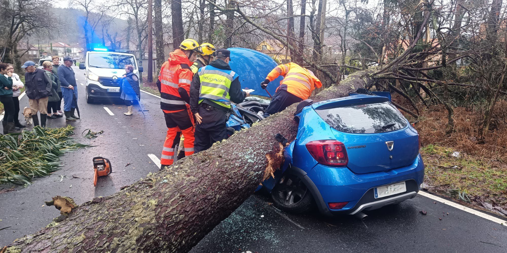 Una conductora de 20 años resultó herida leve este miércoles después de que un pino de grandes dimensiones se desplomase sobre su vehículo cuando circulaba por una carretera provincial a su paso por Caldas de Reis. La rápida actuación de los servicios de emergencia, entre ellos la Policía Local, permitió su rescate y traslado al hospital.