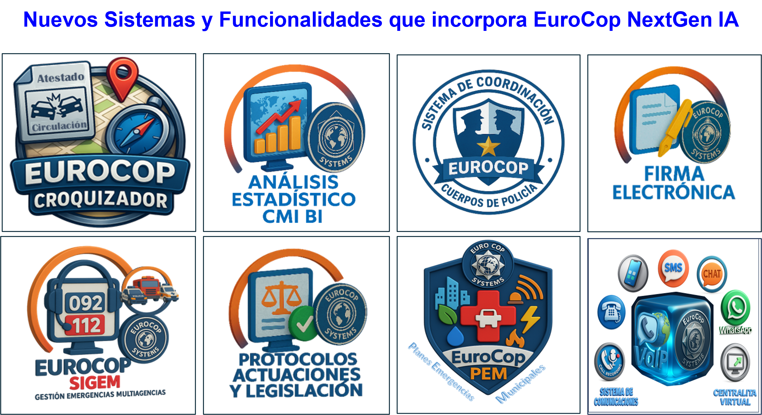 EuroCop NexGen AI simboliza y representa, al mismo tiempo, continuidad en la larga trayectoria de EuroCop y un salto hacia la innovación utilizando la Inteligencia Artificial, garantizando mayor seguridad y protección de la ciudadanía, ofreciendo herramientas que permiten a los Servicios Policiales y a los Servicios de Atención a la Emergencia mayor eficiencia y eficacia, para responder a los complejos retos actuales y futuros en sus tareas.