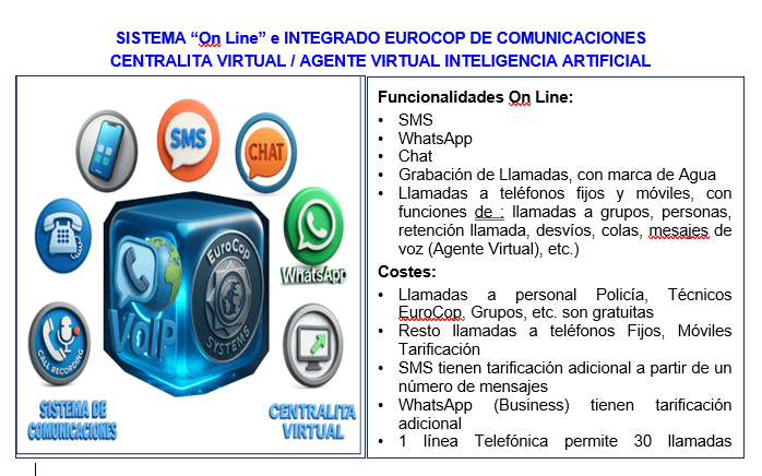 - Consultas basadas en Lenguaje Natural (PLN) a la Base de Datos EuroCop, legislación, protocolos de actuaciones policiales, asistente virtual, Agente Virtual basado en IA, etc.