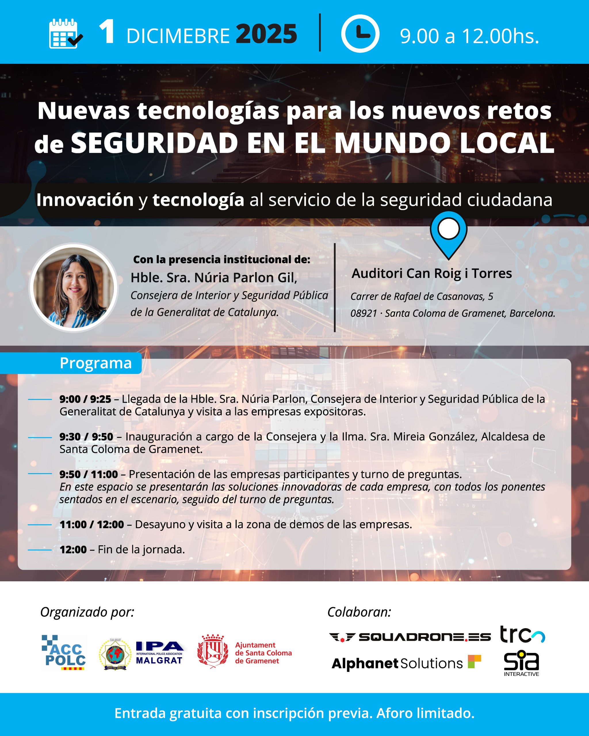La jornada “Nuevas tecnologías para los nuevos retos de seguridad en el ámbito local” tiene como objetivo mostrar cómo la innovación tecnológica puede fortalecer la seguridad en los municipios, optimizando la gestión urbana y mejorando la calidad de vida de los ciudadanos. Durante la sesión se presentarán soluciones concretas en ámbitos como la detección de drones, la automatización de la gestión de denuncias, las salas de mando y el monitoreo de matrículas, todas ellas aplicables al entorno local.