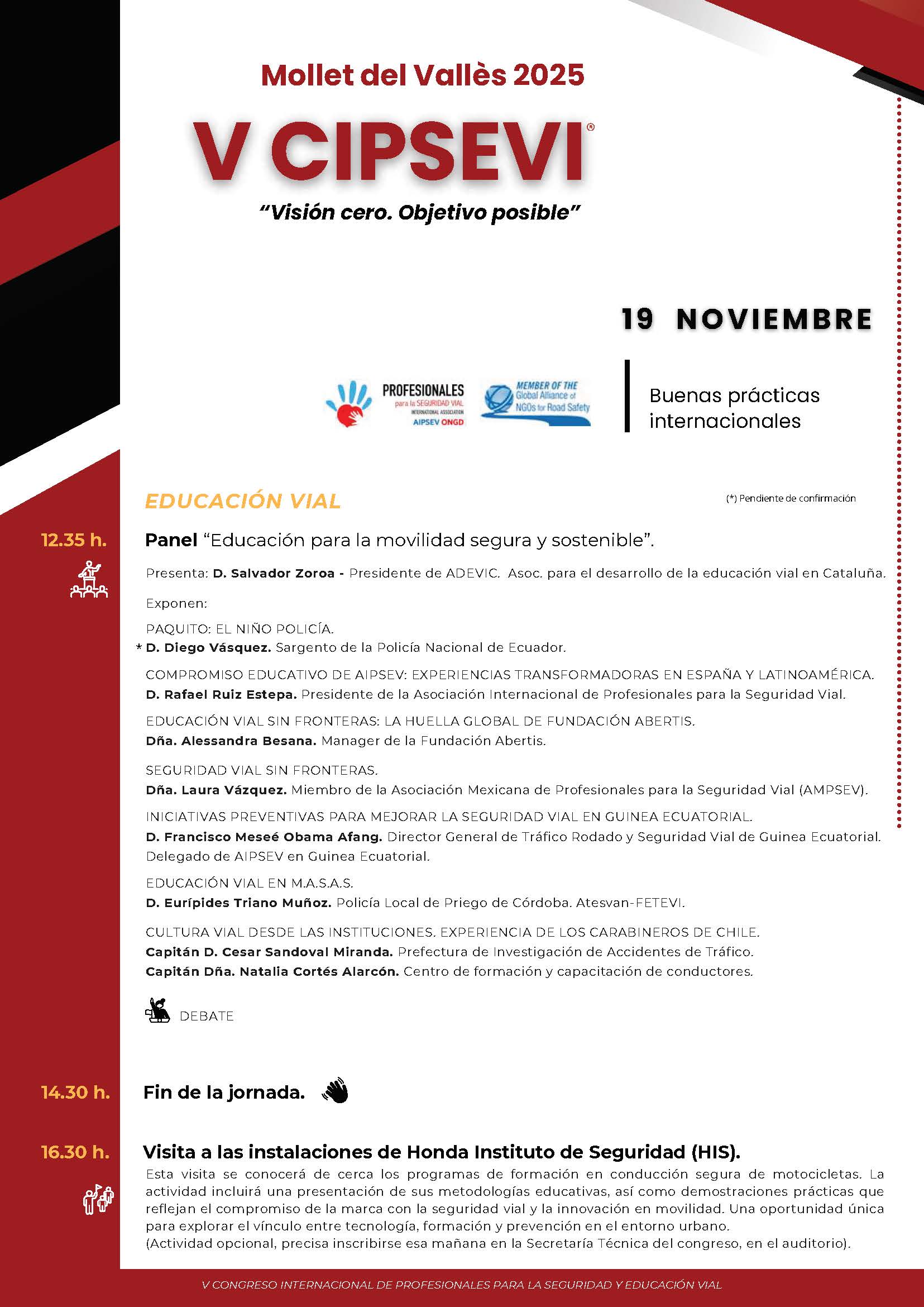 En esta edición, profesionales de España, Polonia, Perú, Ecuador, Colombia, Guinea Ecuatorial, Chile y México, compartirán sus experiencias y buenas prácticas, enriqueciendo el intercambio de conocimientos y fortaleciendo el compromiso global por la seguridad vial y la prevención de los siniestros viales.