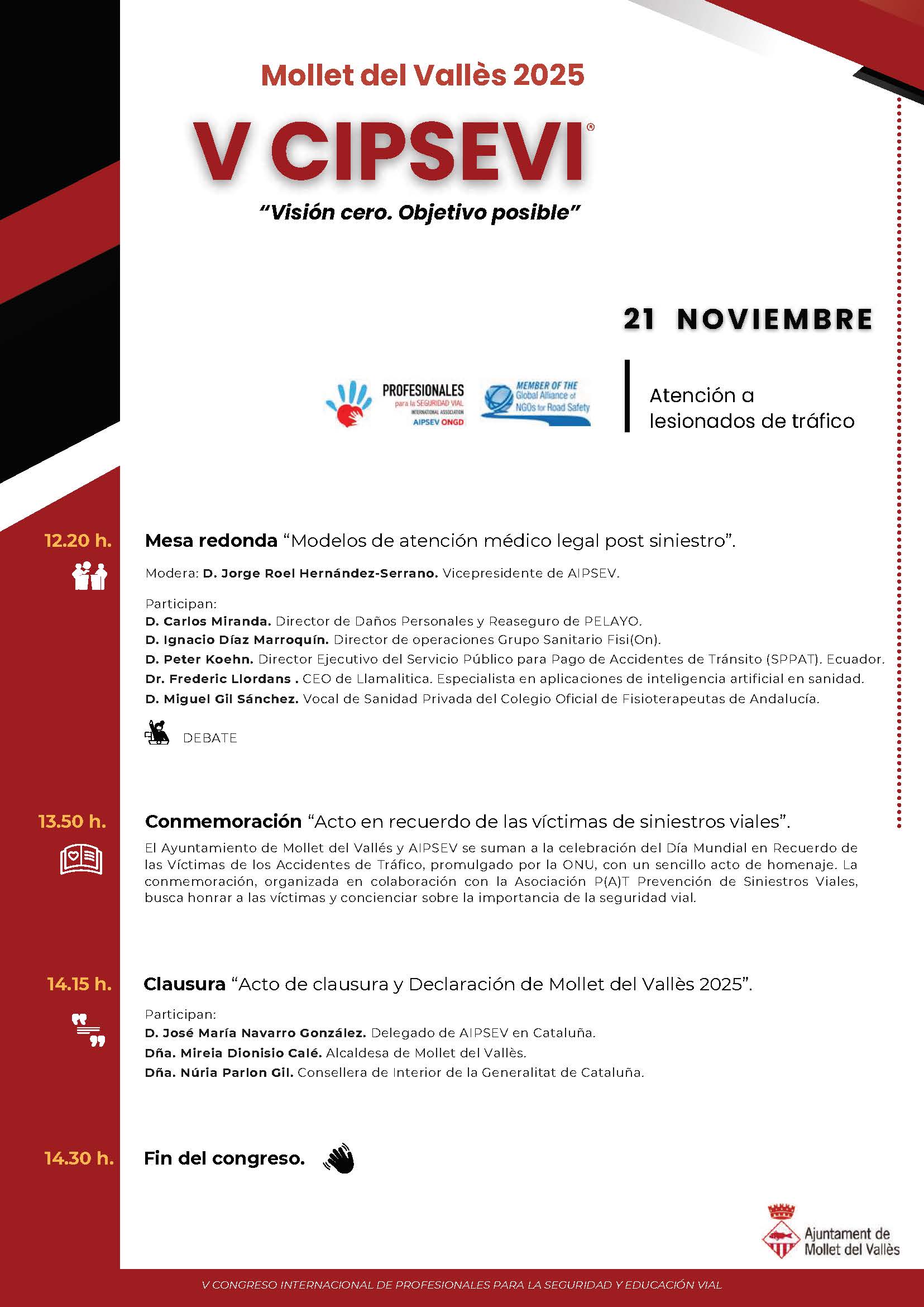 El viernes, víctimas y expertos compartirán la transformación del sufrimiento en compromiso social. Autoridades y especialistas analizarán estrategias nacionales e internacionales para mejorar la asistencia a los lesionados del tráfico. Finalizando con un simulacro de emergencias y un acto en recuerdo de las víctimas del tráfico.