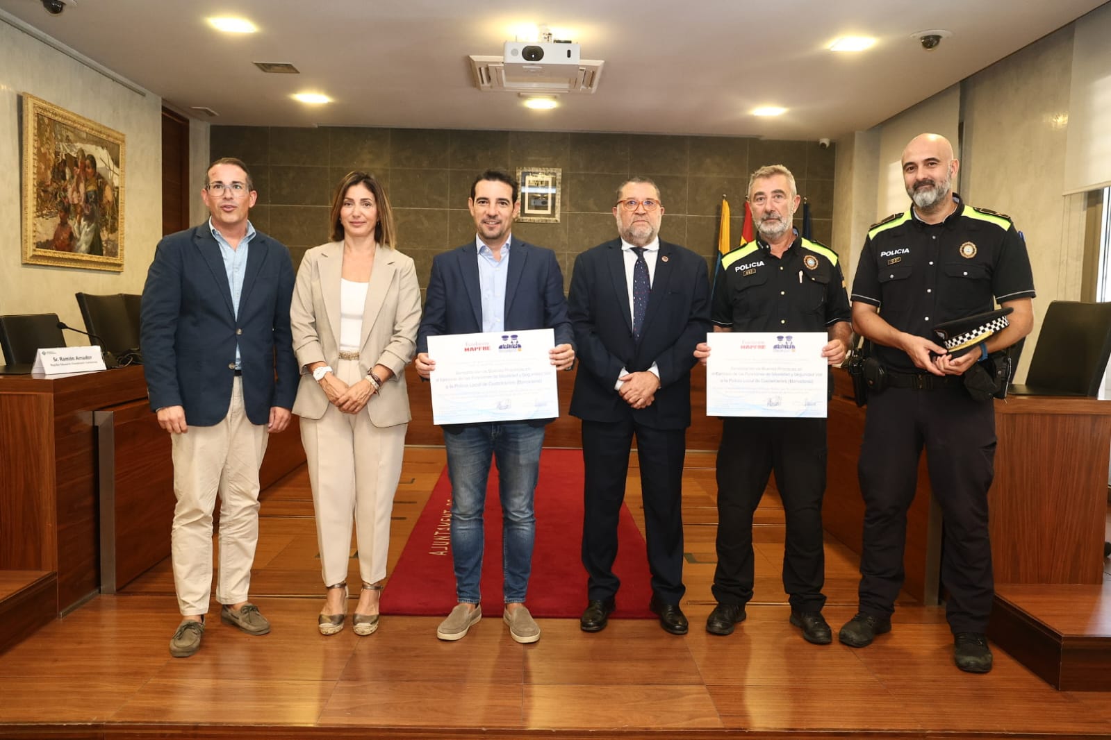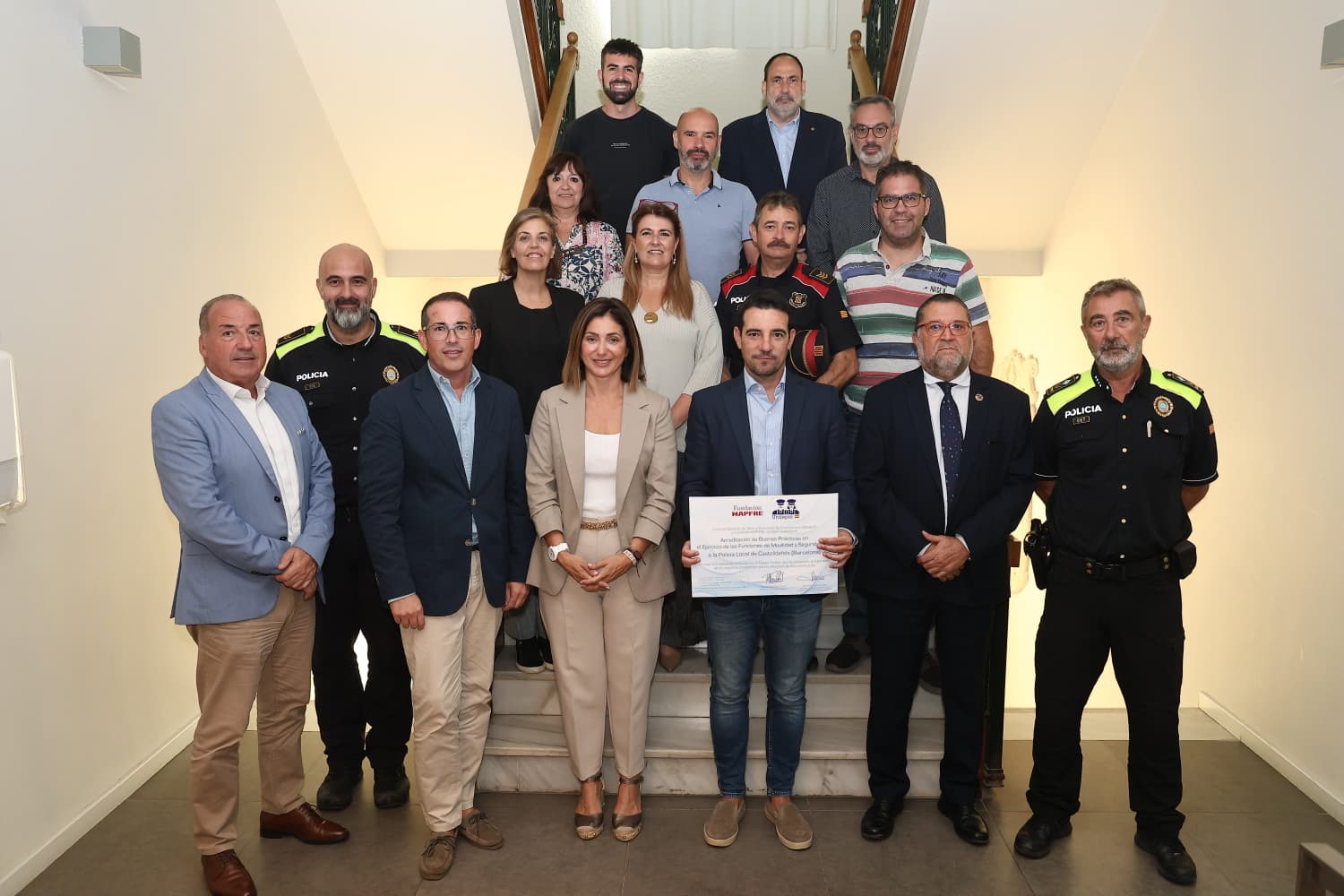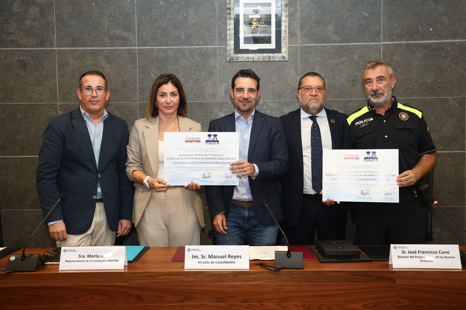 El director de SeguCITY digital y también director de este proyecto, José Francisco Cano de la Vega, y la representante de Fundación Mapfre, Marta Juy Bajo, hicieron entrega en la mañana de ayer de la ‘Acreditación de Buenas Prácticas en el Ejercicio de las Funciones de Movilidad y Seguridad Vial’ a la Policía Local de Castelldefels (Barcelona).