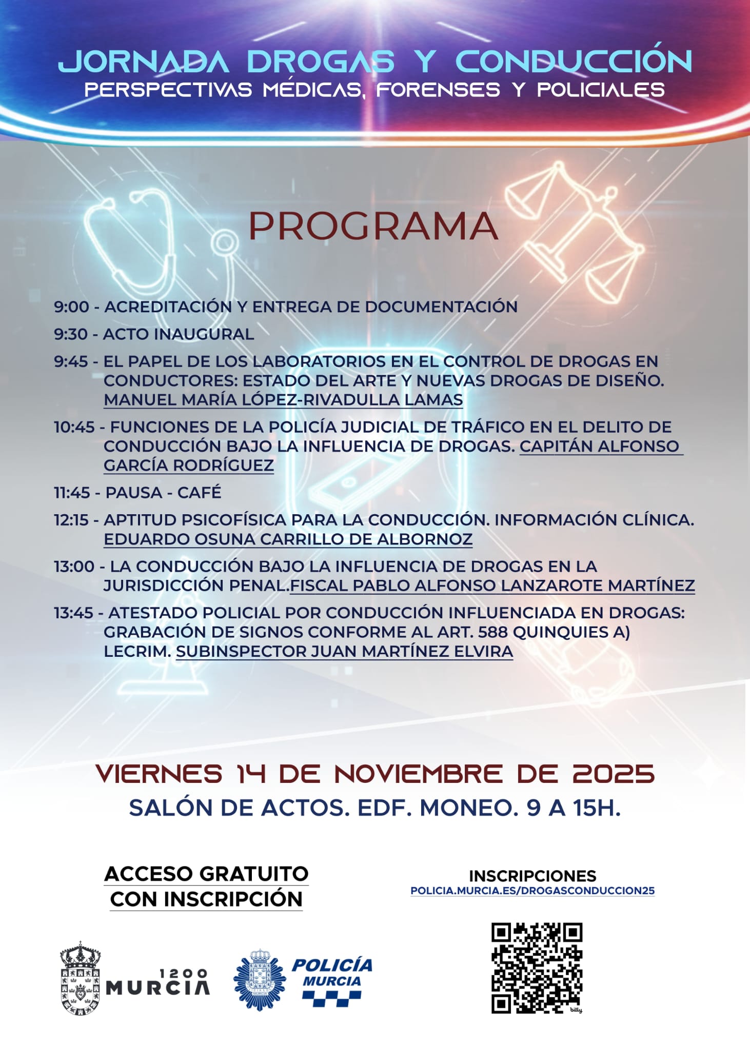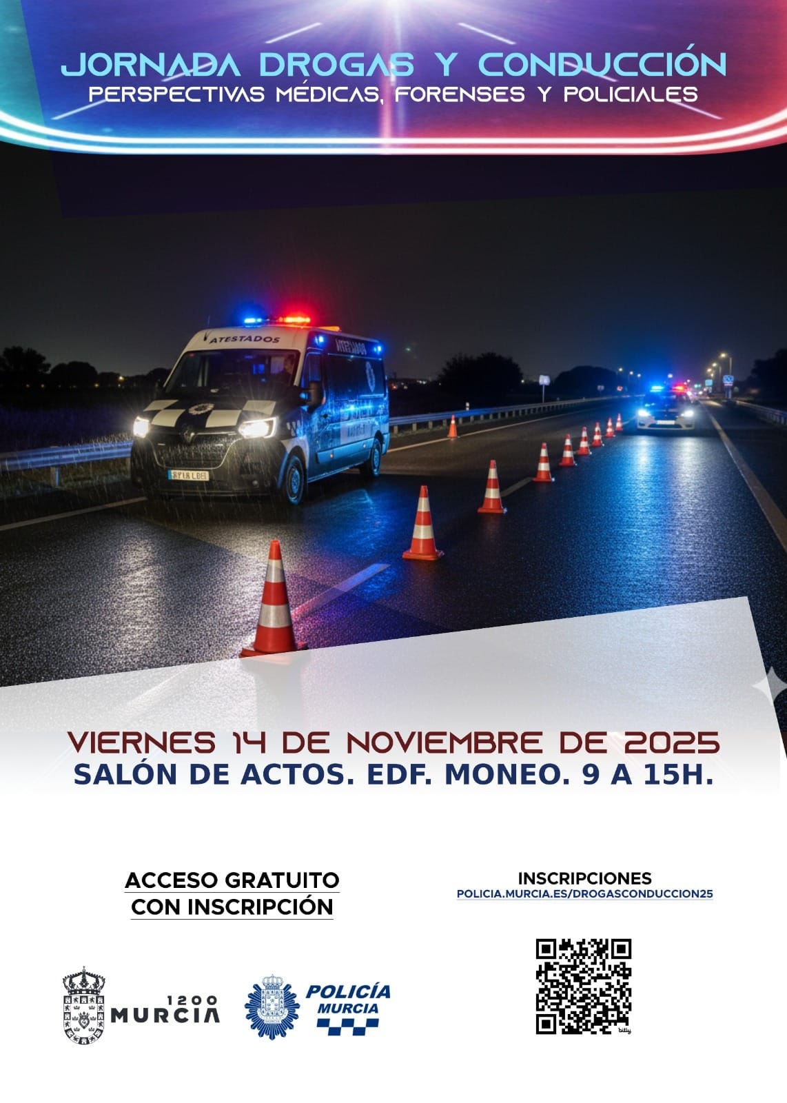 La Policía Local de Murcia vuelve a situarse en la vanguardia de la formación y la investigación aplicada al tráfico y la seguridad vial con la organización de la jornada técnica “Drogas y Conducción: Perspectivas Médicas, Forenses y Policiales”, que se celebrará el viernes 14 de noviembre de 2025 en el Salón de Actos del Edificio Moneo.