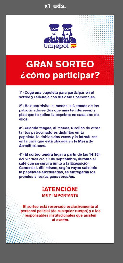 La participación en el sorteo está reservado exclusivamente al personal policial (de cualquier cuerpo) y a los responsables institucionales que asistan al evento. Y recuerda que sólo serán válidas las papeletas que tengan, como mínimo, 6 sellos de 6 patrocinadores distintos.