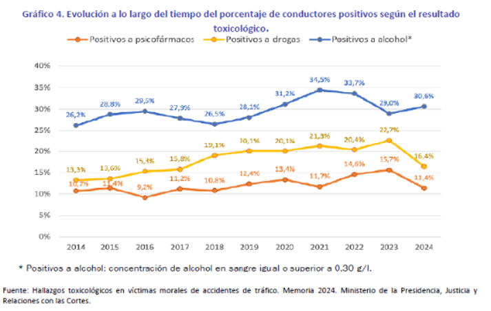 Tal y como se desprende de la Memoria 2024 de Hallazgos Toxicológicos en Víctimas de Accidente de Tráfico, elaborada por el Instituto Nacional de Toxicología y Ciencias Forenses con la colaboración del Observatorio Nacional de Seguridad Vial, casi la mitad (48,2%) de los conductores fallecidos en carretera en 2024, que fueron sometidos autopsia y a un análisis toxicológico dieron positivo en alcohol, drogas o psicofármacos, aisladamente o en combinación, frente al 53,6 % del año 2023.