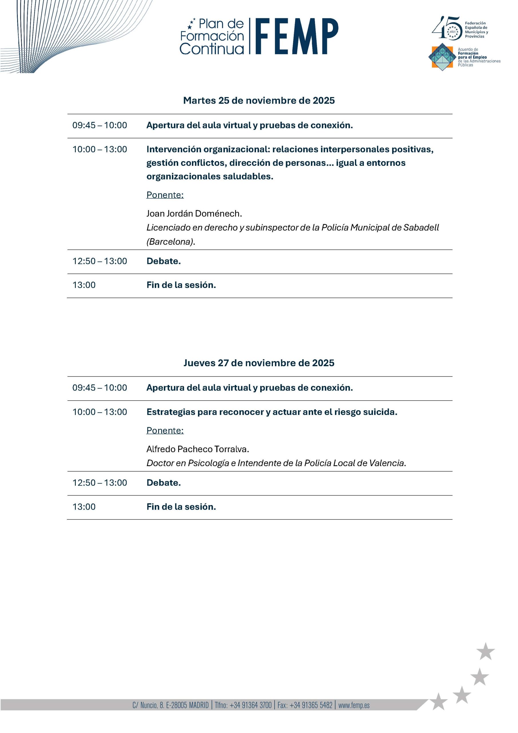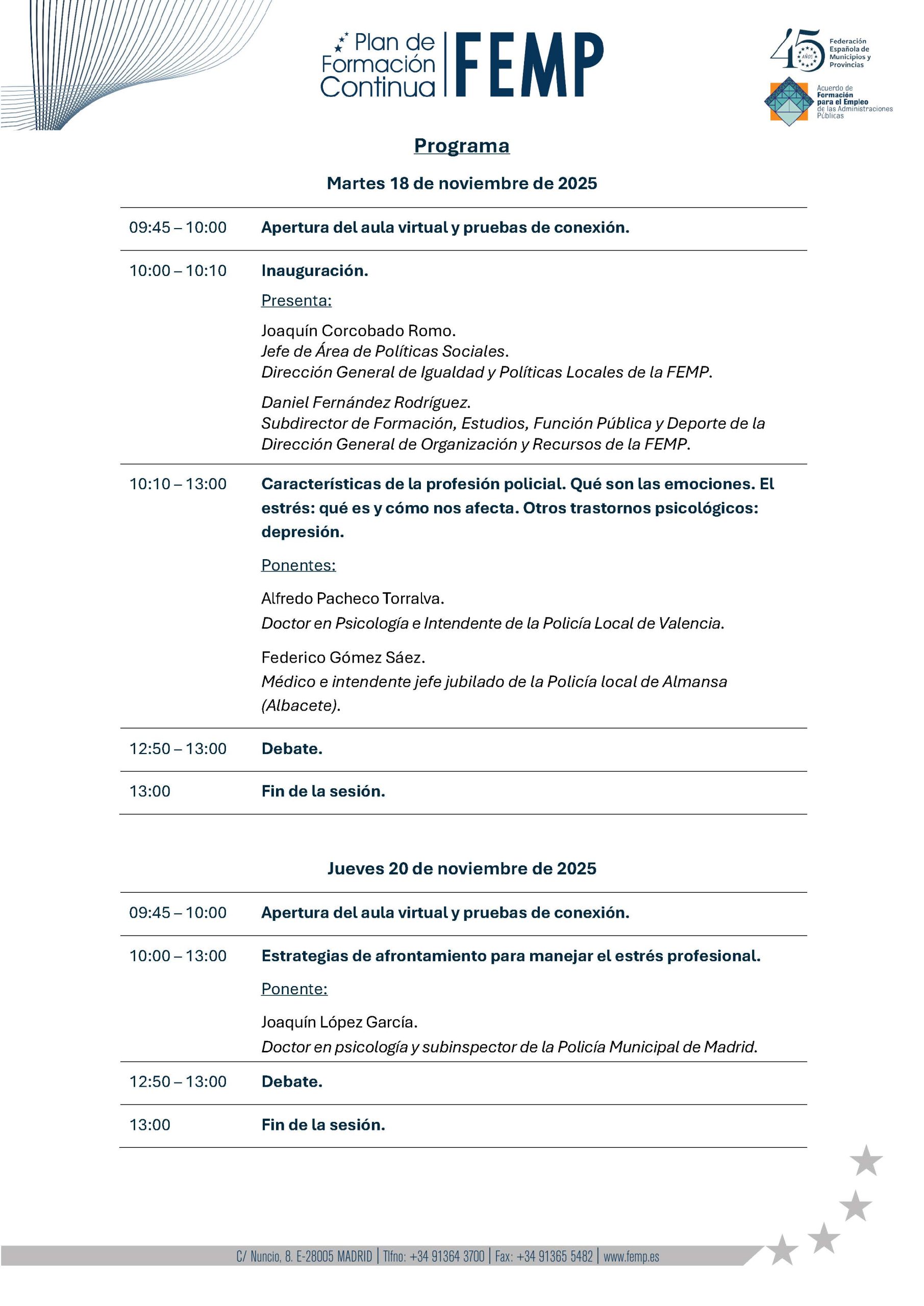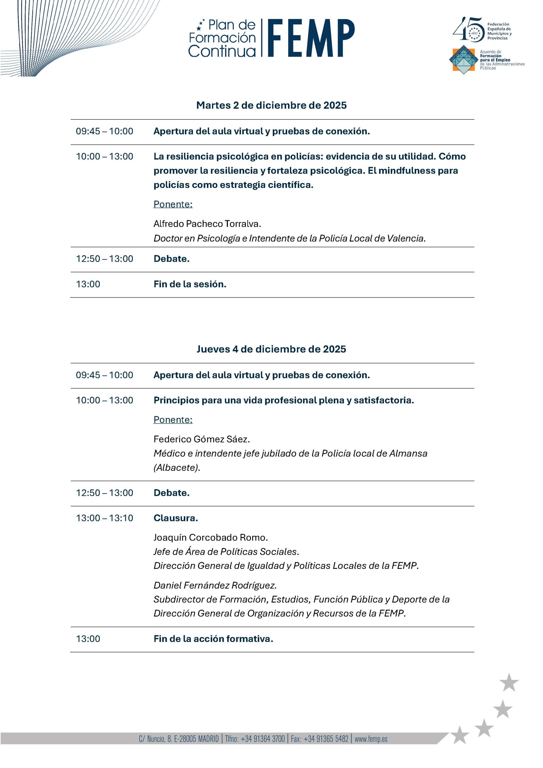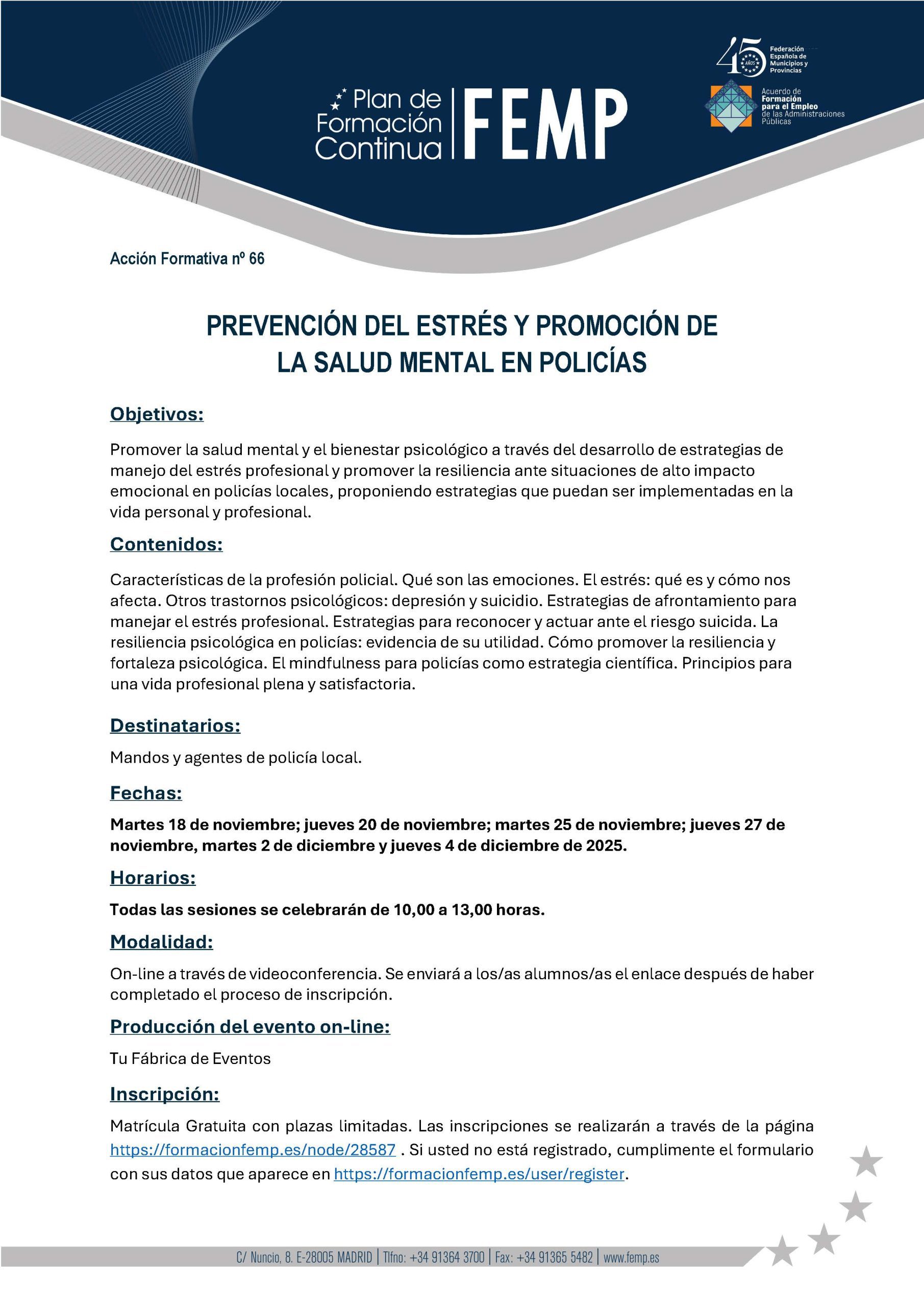 Con el objetivo de promover la salud mental y el bienestar psicológico a través del desarrollo de estrategias de manejo del estrés profesional y promover la resiliencia ante situaciones de alto impacto emocional en policías locales, proponiendo estrategias que puedan ser implementadas en la vida personal y profesional, la Federación Española de Municipios y Provincias oferta el curso sobre Prevención del estrés y promoción de la salud mental en policías.