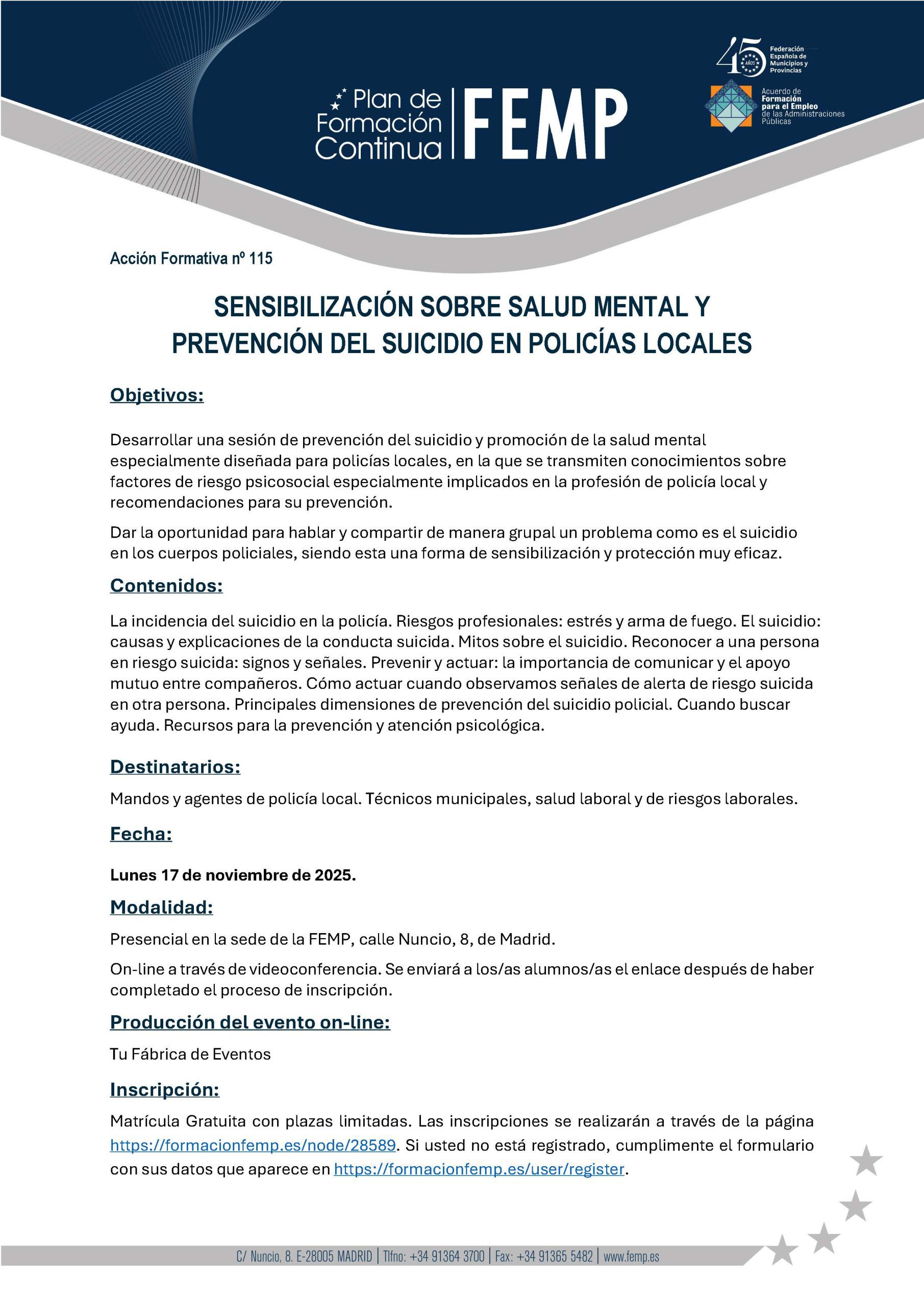 El objetivo de la acción formativa es desarrollar una sesión de prevención del suicidio y promoción de la salud mental especialmente diseñada para policías locales, en la que se transmiten conocimientos sobre factores de riesgo psicosocial especialmente implicados en la profesión de policía local y recomendaciones para su prevención.