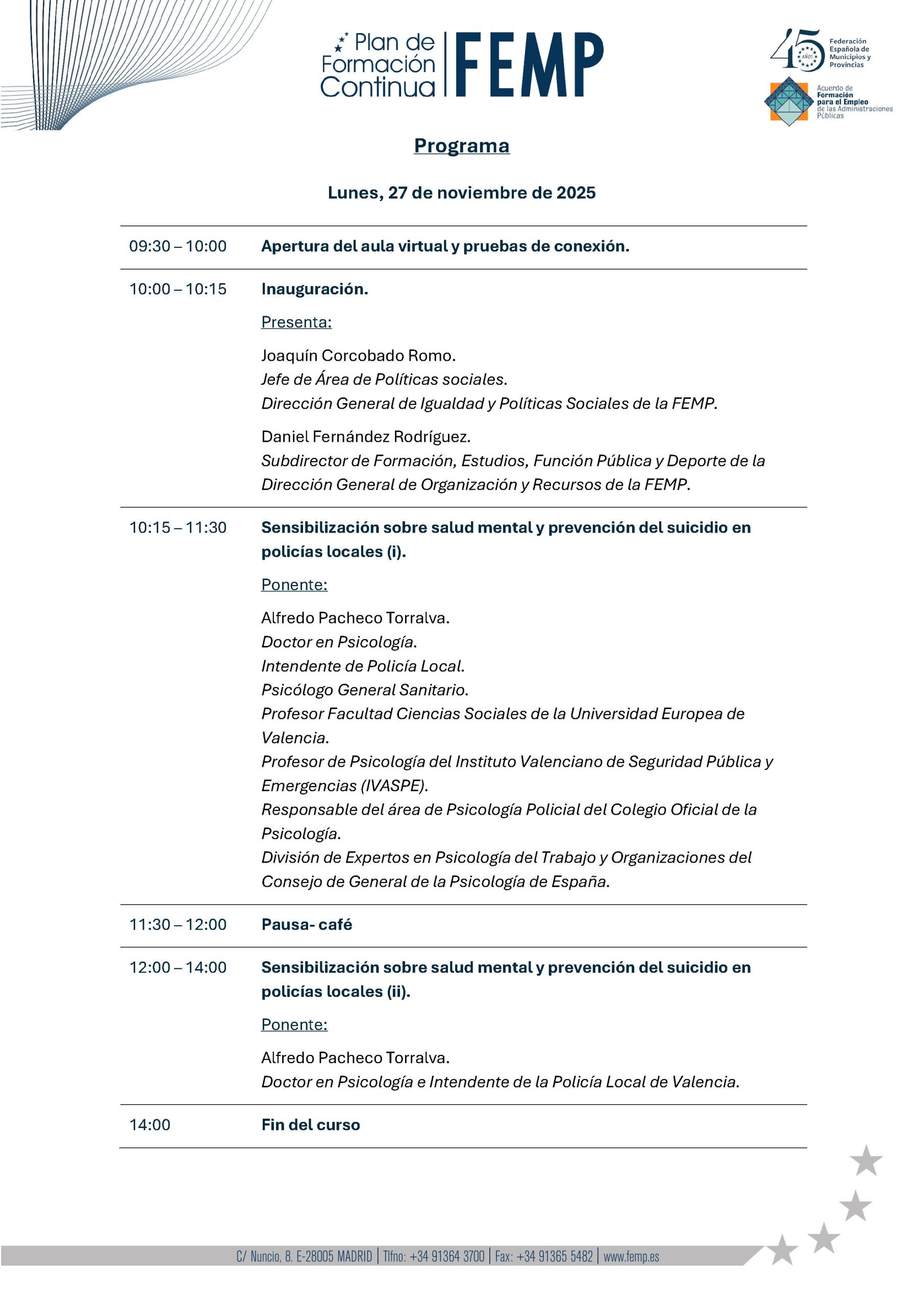 La incidencia del suicidio en la policía. Riesgos profesionales: estrés y arma de fuego. El suicidio: causas y explicaciones de la conducta suicida. Mitos sobre el suicidio. Reconocer a una persona en riesgo suicida: signos y señales. Prevenir y actuar: la importancia de comunicar y el apoyo mutuo entre compañeros. Cómo actuar cuando observamos señales de alerta de riesgo suicida en otra persona. Principales dimensiones de prevención del suicidio policial. Cuando buscar ayuda. Recursos para la prevención y atención psicológica.