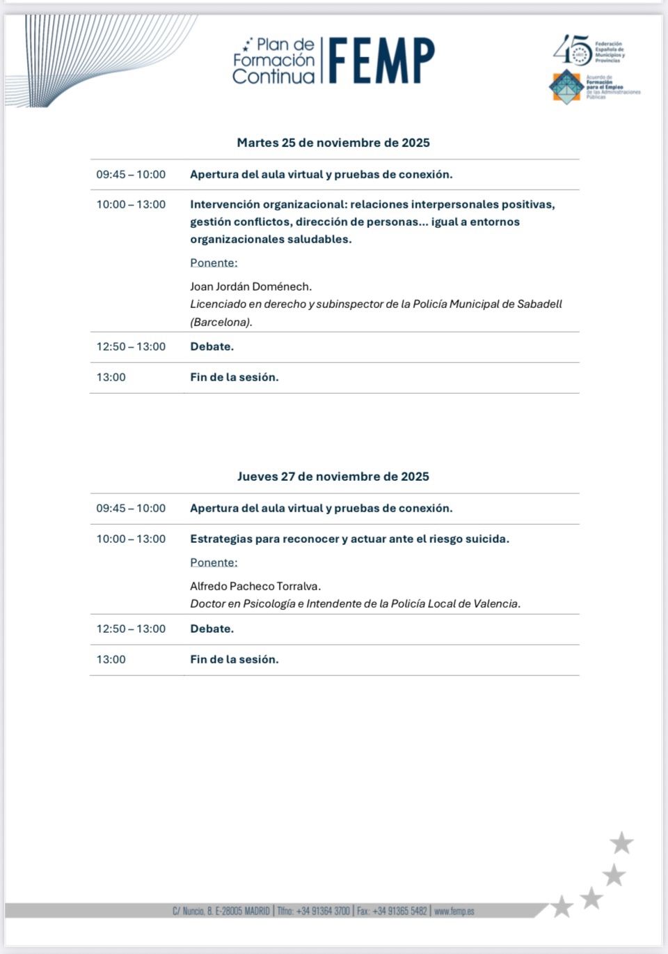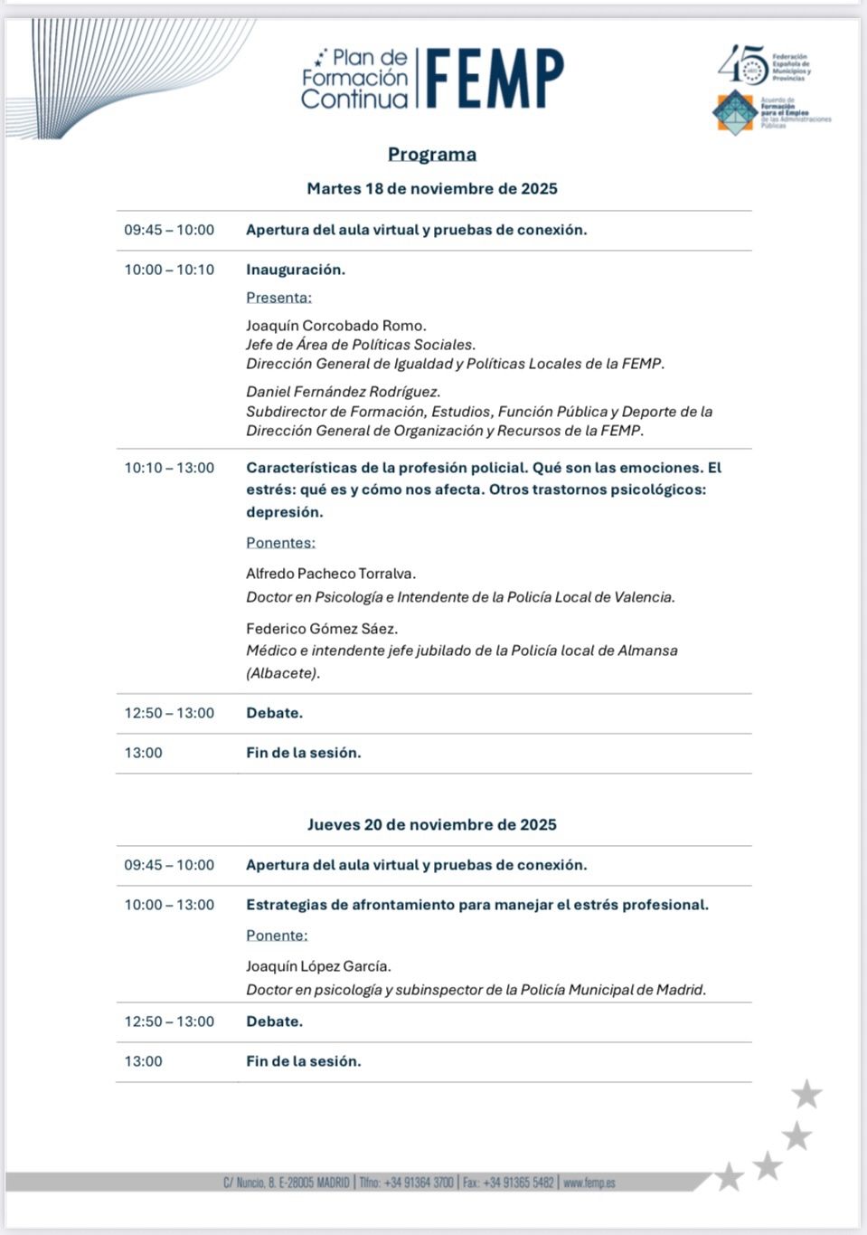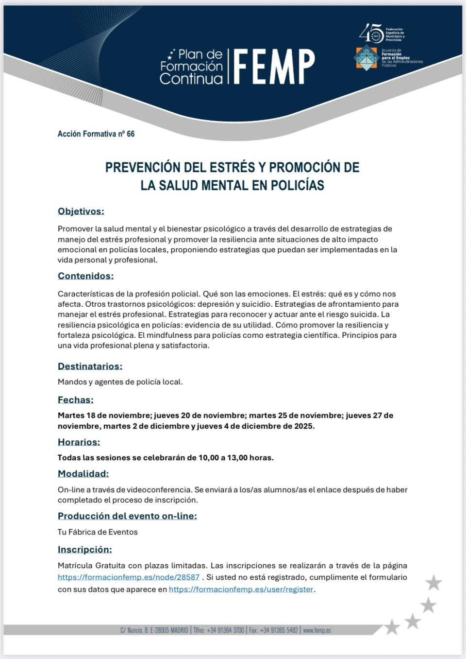 Y ahora con esta formación, nos acercamos al objetivo preventivo de beneficio para los policías y auxilio de su salud mental. Por ello, hemos propuesto en este año la programación de cursos on line y presenciales para trabajar la Salud Mental, organizado por FEMP, para todos los policías de toda España.
